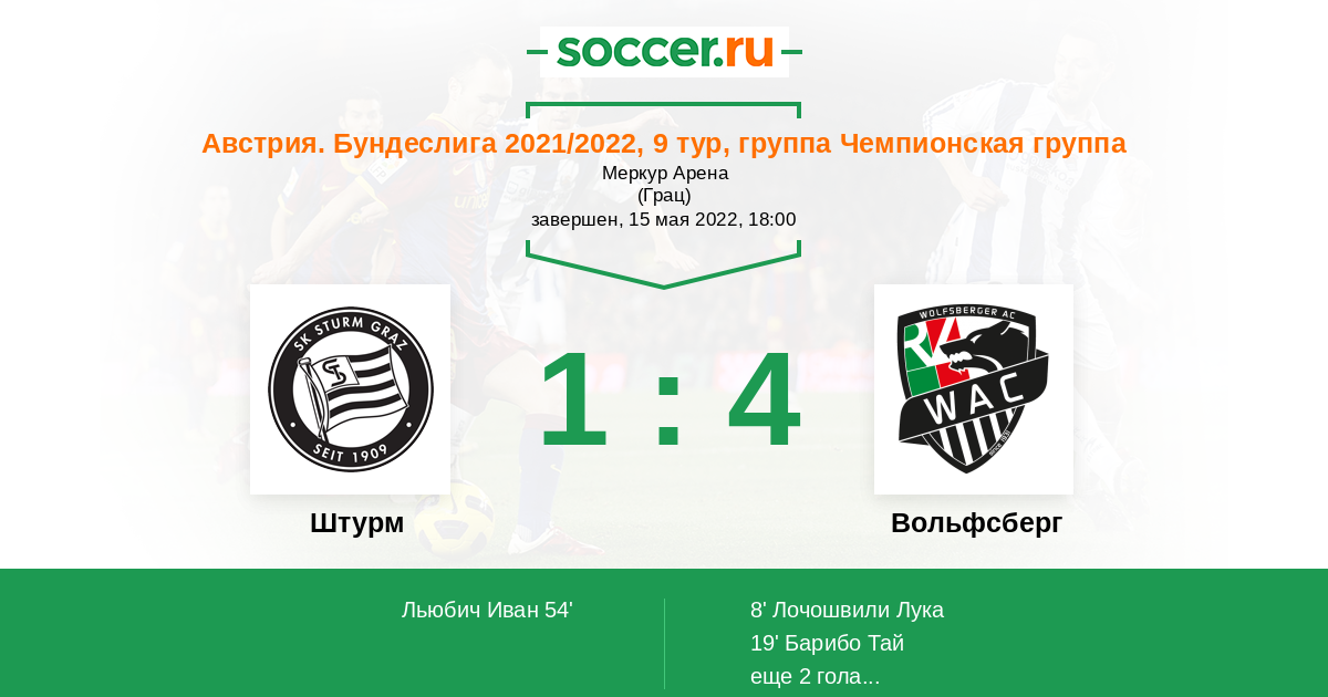 Австрия. Бундеслига 03.04.2022 Вольфсберг Логотип футбольный клуб Вольфсберг 0:2 Логотип футбольный клуб Штурм (Грац) Штурм
