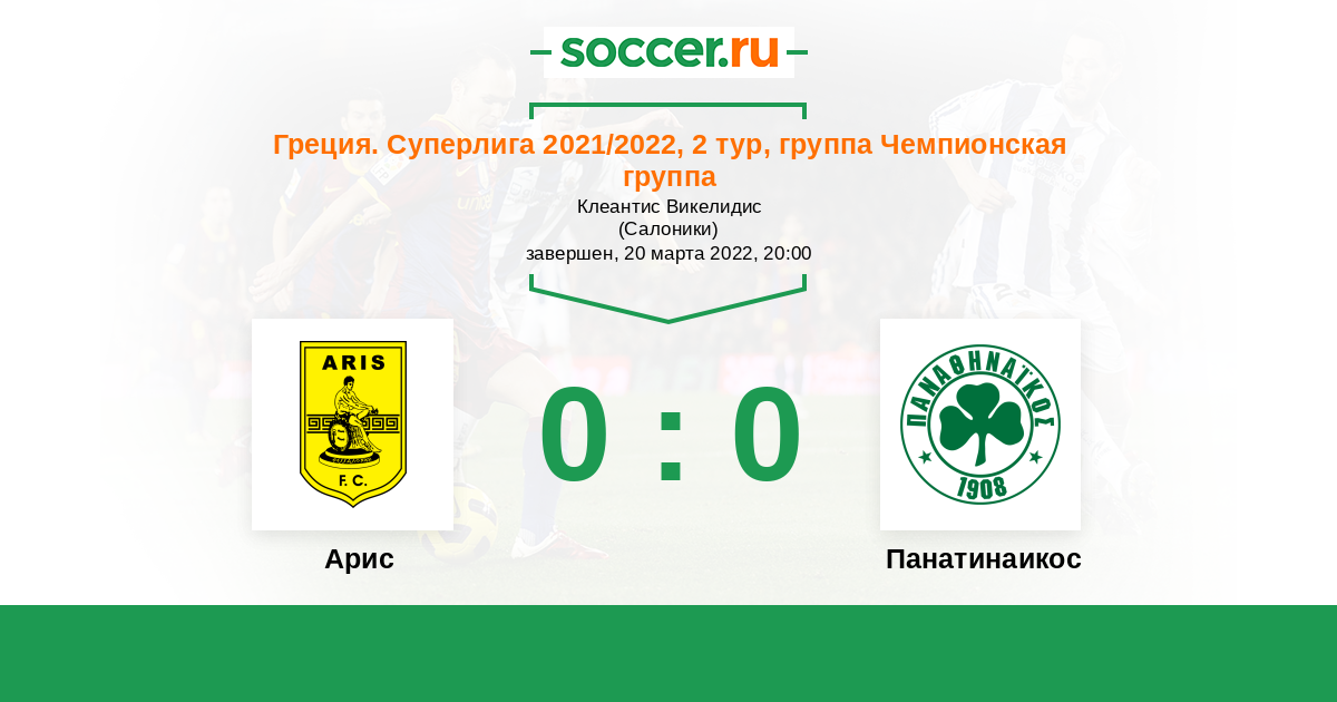 Греция. Суперлига 22.09.2021 Арис Логотип футбольный клуб Арис (Салоники) 1:0 Логотип футбольный клуб Панатинаикос (Афины) Панатинаикос