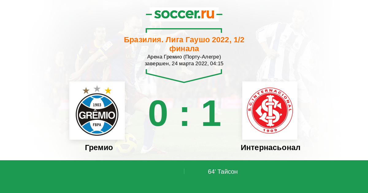 Бразилия. Лига Гаушо 10.03.2022 Интернасьонал Логотип футбольный клуб Интернасьонал (Порту-Алегри) 1:0 Логотип футбольный клуб Гремио (Порту-Алегри) Гремио