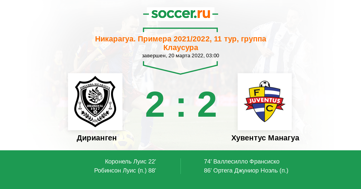 Никарагуа. Примера 01.04.2021 Дирианген Логотип футбольный клуб Дирианген (Дириамба) 4:2 Логотип футбольный клуб Хувентус Манагуа Хувентус Манагуа