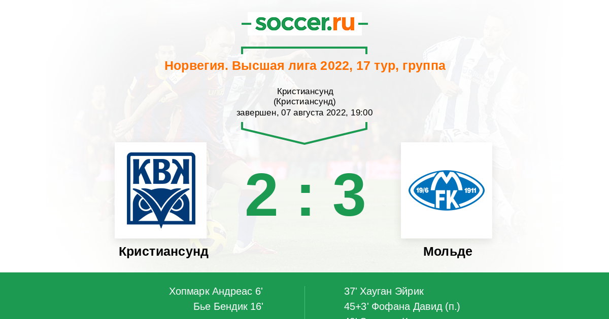 Норвегия. Высшая лига 21.05.2022 Мольде Логотип футбольный клуб Мольде 2:1 Логотип футбольный клуб Кристиансунд Кристиансунд