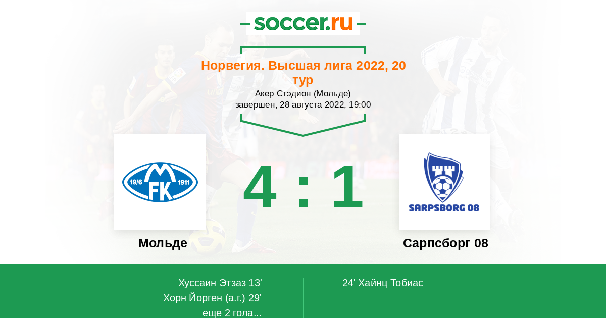 Норвегия. Высшая лига 22.07.2023 Мольде Логотип футбольный клуб Мольде 5:1 Логотип футбольный клуб Сарпсборг 08 Сарпсборг 08