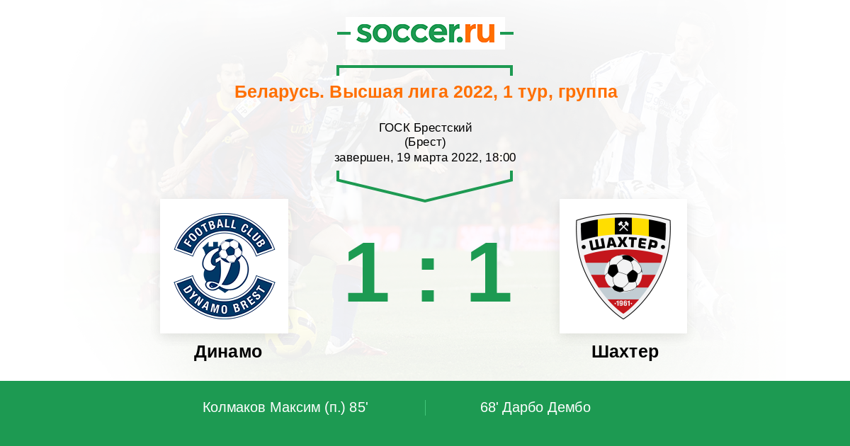 Беларусь. Высшая лига 26.06.2021 Шахтер Логотип футбольный клуб Шахтер (Солигорск) 1:1 Логотип футбольный клуб Динамо (Брест) Динамо