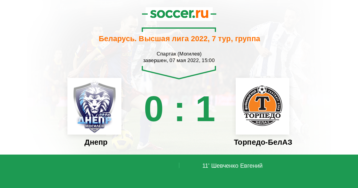 Беларусь. Высшая лига 18.09.2022 Торпедо-БелАЗ Логотип футбольный клуб Торпедо-БелАЗ (Жодино) 1:0 Логотип футбольный клуб Днепр (Могилев) Днепр