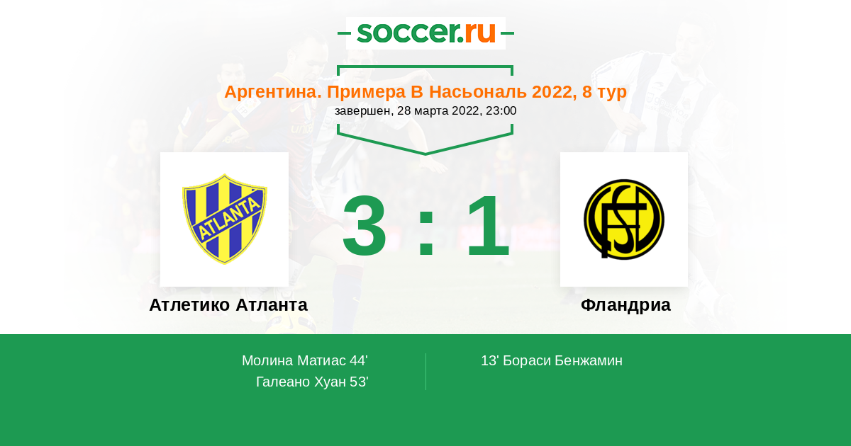 Аргентина. Примера Б Метро 07.03.2015 Фландриа Логотип футбольный клуб Фландриа (Лухан) 2:1 Логотип футбольный клуб Атлетико Атланта (Буэнос-Айрес) Атлетико Атланта