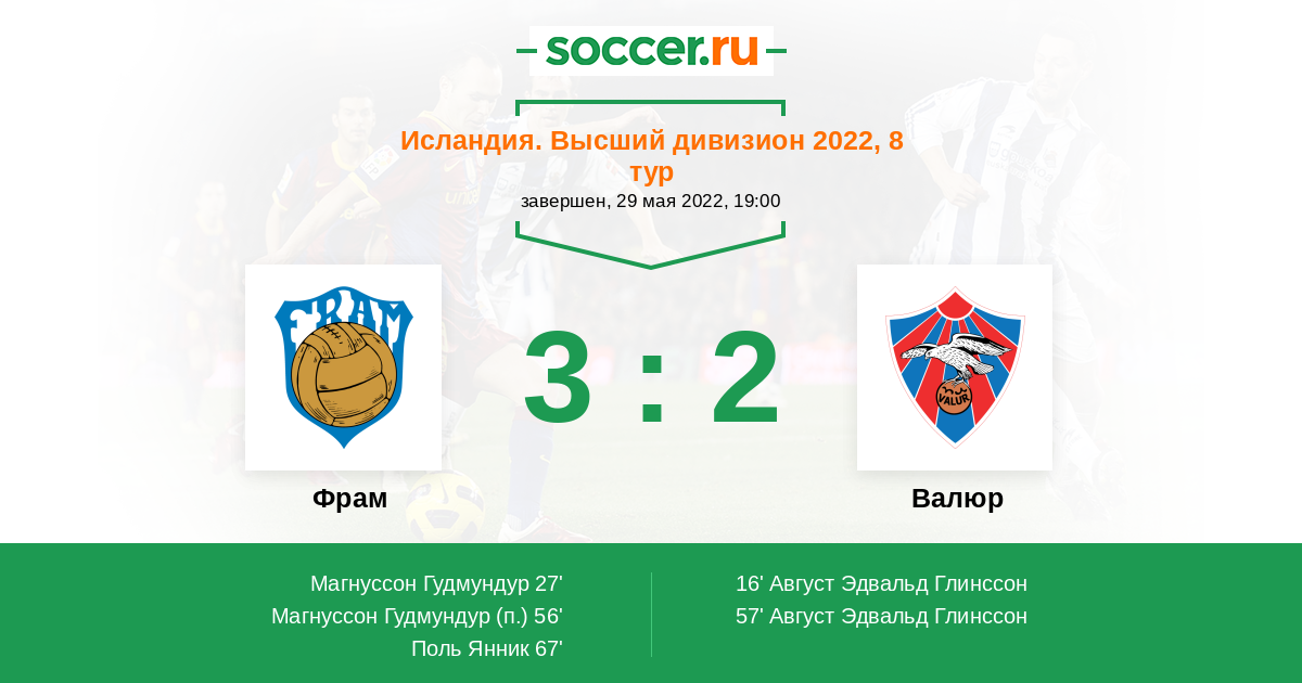 Исландия. Высший дивизион 23.07.2012 Валюр Логотип футбольный клуб Валюр (Рейкьявик) 0:2 Логотип футбольный клуб Фрам (Рейкьявик) Фрам