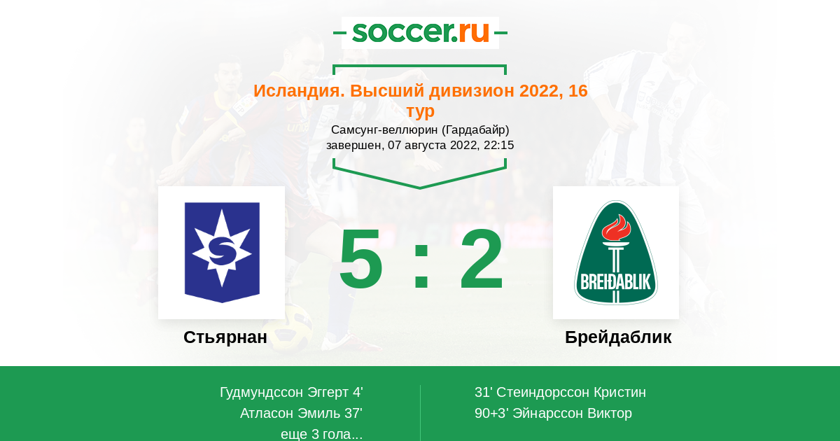 Исландия. Высший дивизион 27.08.2016 Брейдаблик Логотип футбольный клуб Брейдаблик (Коупавогюр) 2:1 Логотип футбольный клуб Стьярнан (Гардабайр) Стьярнан