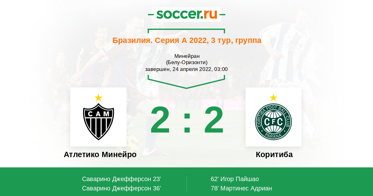 Бразилия. Серия А 21.05.2023 Коритиба Логотип футбольный клуб Коритиба 1:2 Логотип футбольный клуб Атлетико Минейро (Белу-Оризонти) Атлетико Минейро