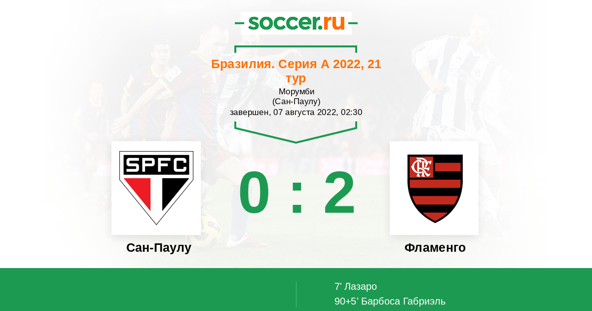 Бразилия. Серия А 25.07.2021 Фламенго Логотип футбольный клуб Фламенго (Рио-де-Жанейро) 5:1 Логотип футбольный клуб Сан-Паулу Сан-Паулу
