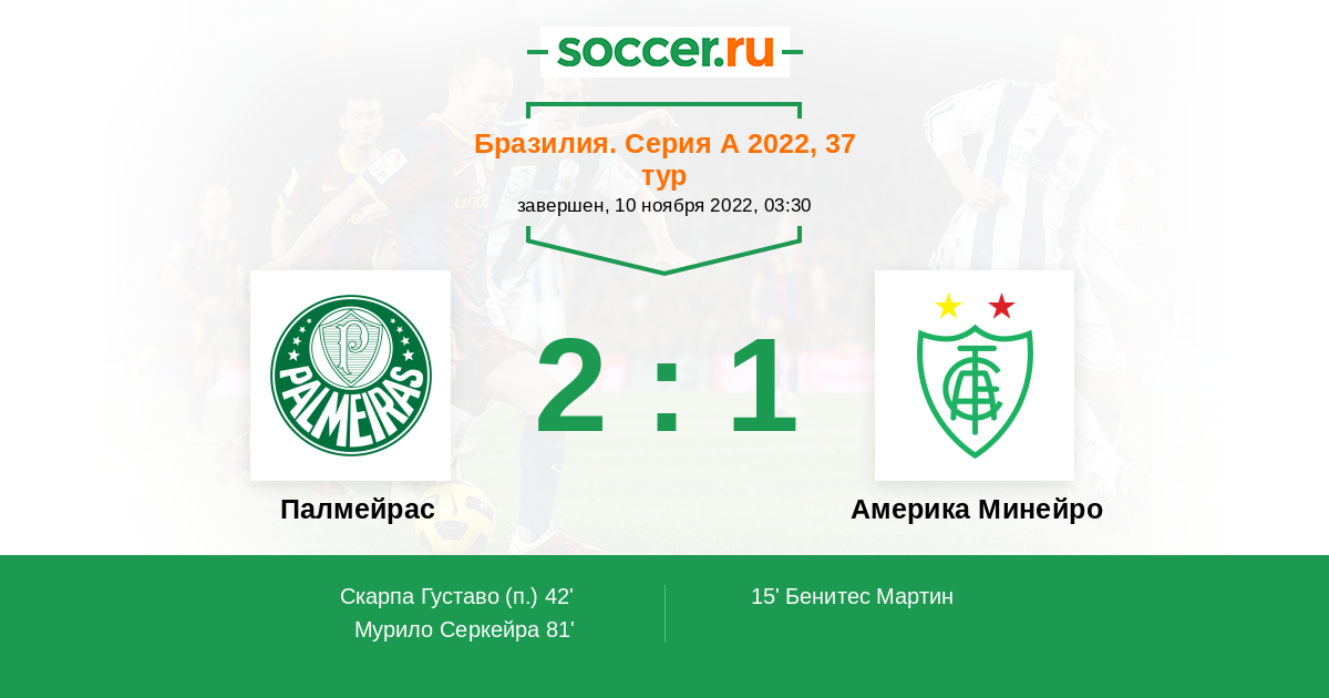 Бразилия. Серия А 07.10.2021 Америка Минейро Логотип футбольный клуб Америка Минейро (Белу-Оризонти) 2:1 Логотип футбольный клуб Палмейрас (Сан-Паулу) Палмейрас