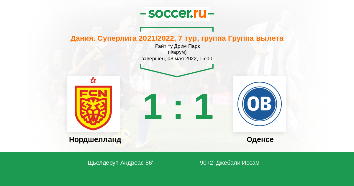 Дания. Суперлига 03.04.2022 Оденсе Логотип футбольный клуб Оденсе 2:1 Логотип футбольный клуб Нордшелланд (Фарум) Нордшелланд