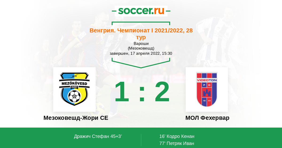 Венгрия. Чемпионат 1 11.09.2021 Мезоковешд-Жори СЕ Логотип футбольный клуб Мезоковешд-Жори СЕ 2:2 Логотип футбольный клуб МОЛ Фехервар (Секешфехервар) МОЛ Фехервар