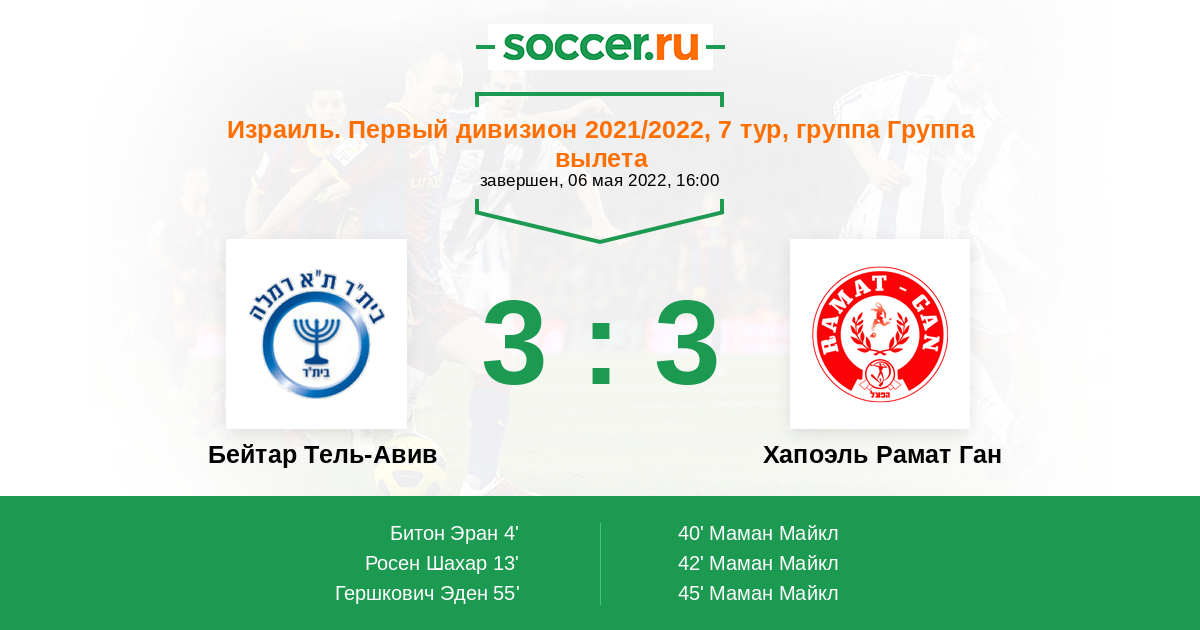 Израиль. Первый дивизион 14.03.2022 Бейтар Тель-Авив Логотип футбольный клуб Бейтар Тель-Авив 2:4 Логотип футбольный клуб Хапоэль Рамат Ган Хапоэль Рамат Ган