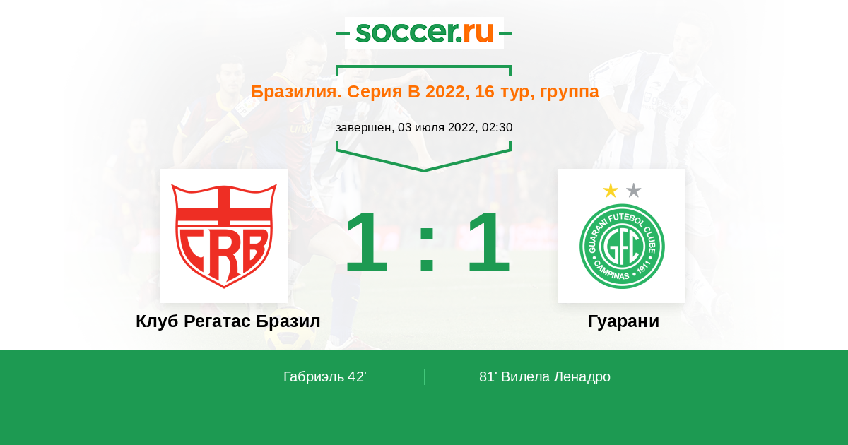 Бразилия. Серия В 22.07.2017 Клуб Регатас Бразил Логотип футбольный клуб Клуб Регатас Бразил (Масейо) 1:1 Логотип футбольный клуб Гуарани (Кампинас) Гуарани