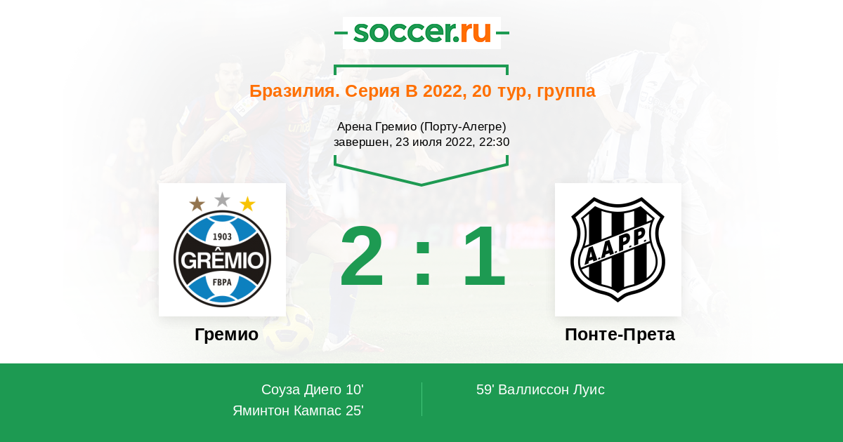 Бразилия. Серия А 16.07.2017 Гремио Логотип футбольный клуб Гремио (Порту-Алегри) 3:1 Логотип футбольный клуб Понте-Прета (Кампинас) Понте-Прета