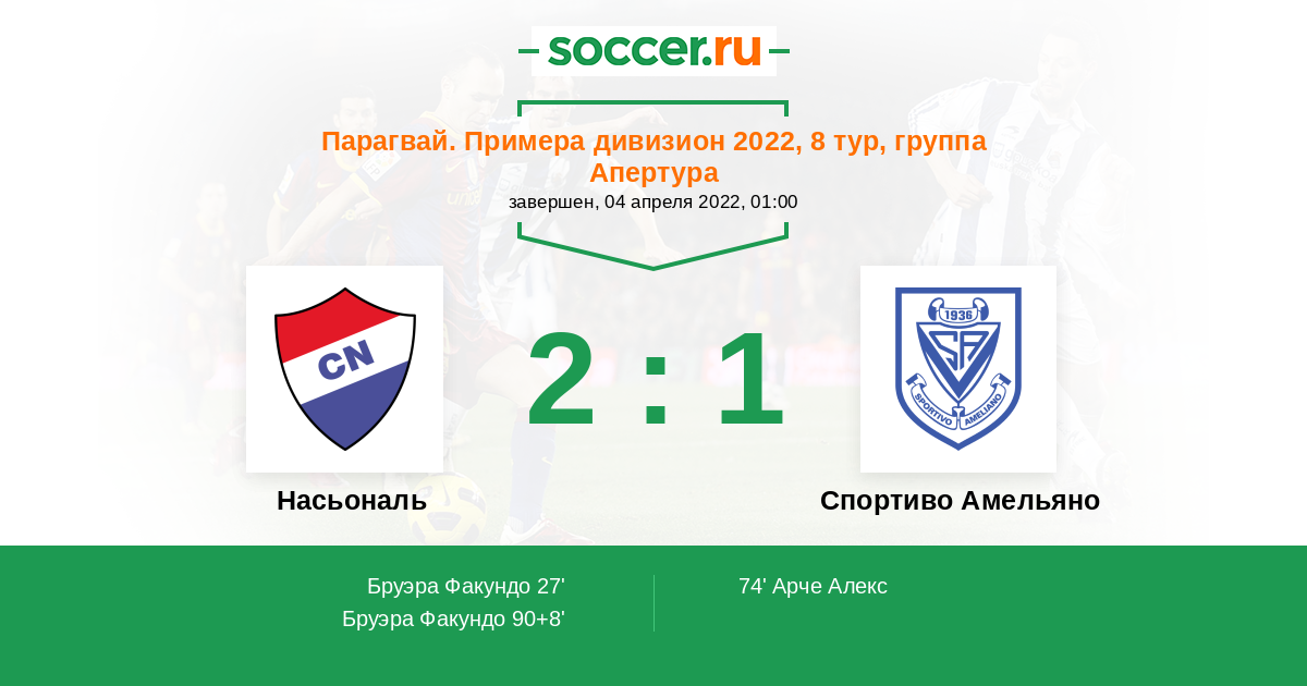 Парагвай. Примера дивизион 06.04.2024 Насьональ Логотип футбольный клуб Насьональ (Асунсьон) 1:1 Логотип футбольный клуб Спортиво Амельяно (Асунсьон) Спортиво Амельяно