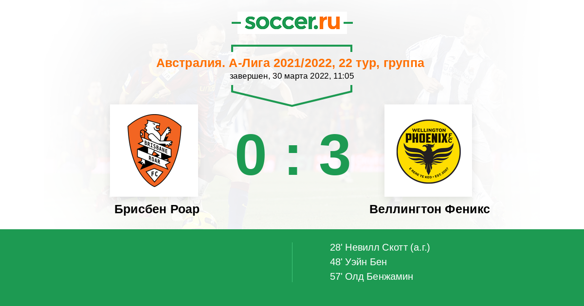 Австралия. А-Лига 12.03.2022 Брисбен Роар Логотип футбольный клуб Брисбен Роар 2:1 Логотип футбольный клуб Веллингтон Феникс Веллингтон Феникс