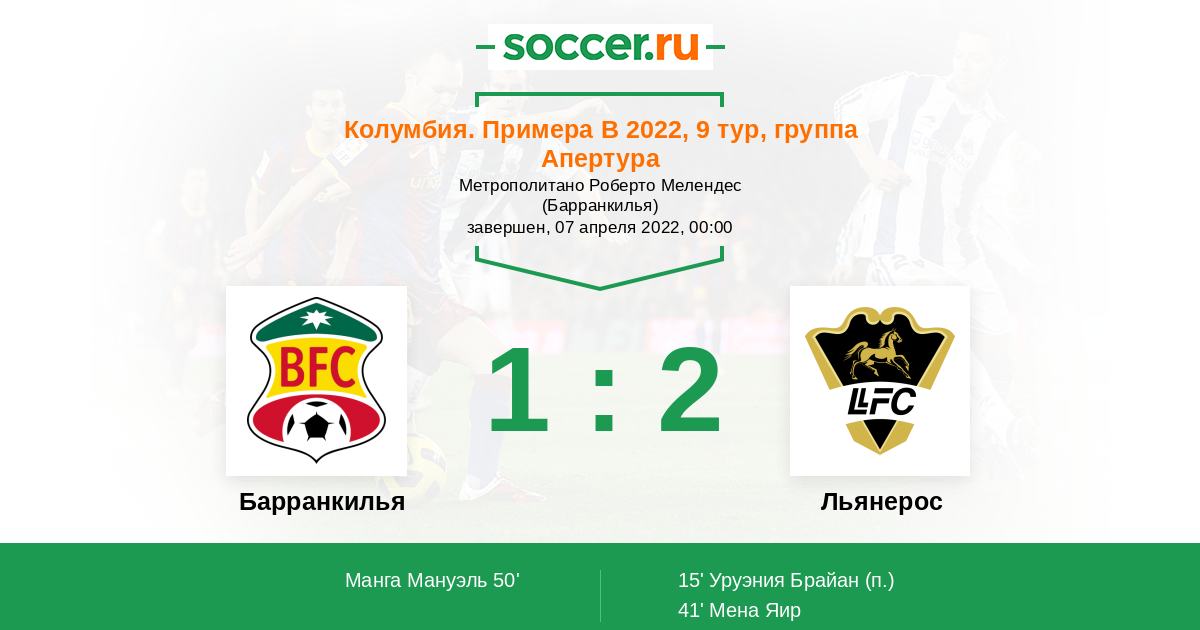 Колумбия. Примера B 11.04.2023 Барранкилья Логотип футбольный клуб Барранкилья 0:1 Логотип футбольный клуб Льянерос (Вильявисенсио) Льянерос