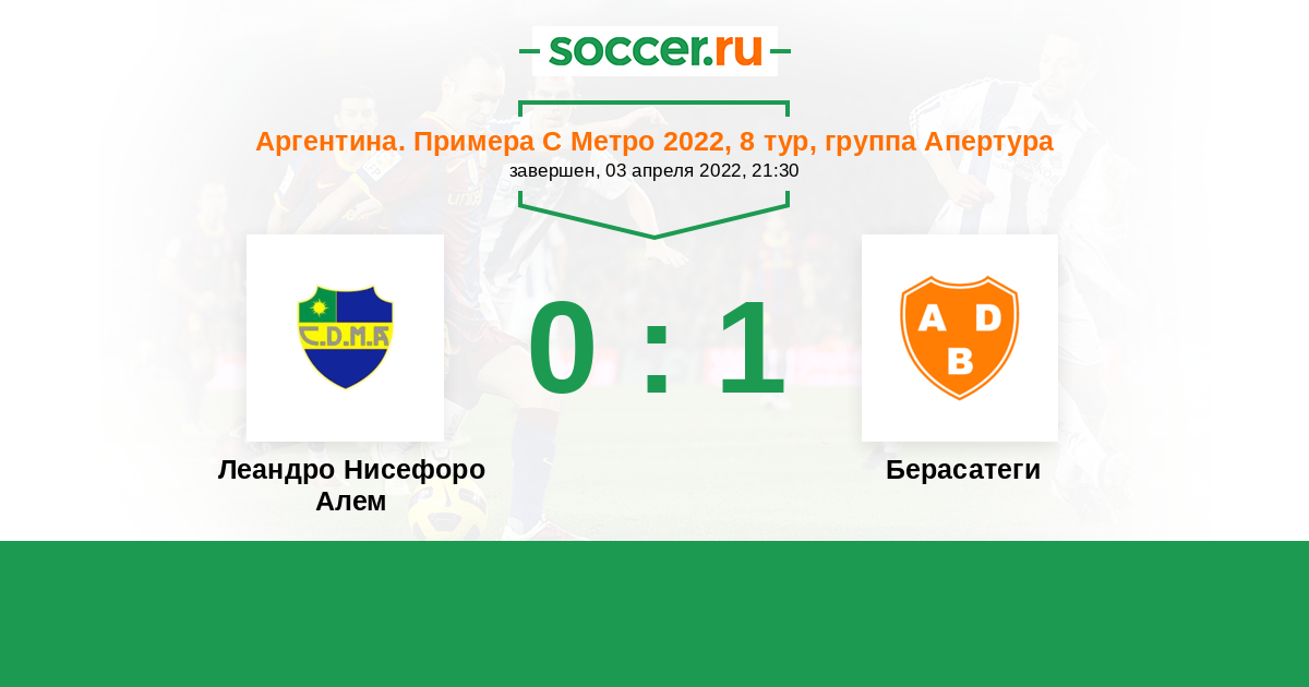 Аргентина. Примера С Метро 22.02.2018 Леандро Нисефоро Алем Логотип футбольный клуб Леандро Нисефоро Алем (Буэнос-Айрес) 4:2 Логотип футбольный клуб Берасатеги (Буэнос-Айрес) Берасатеги