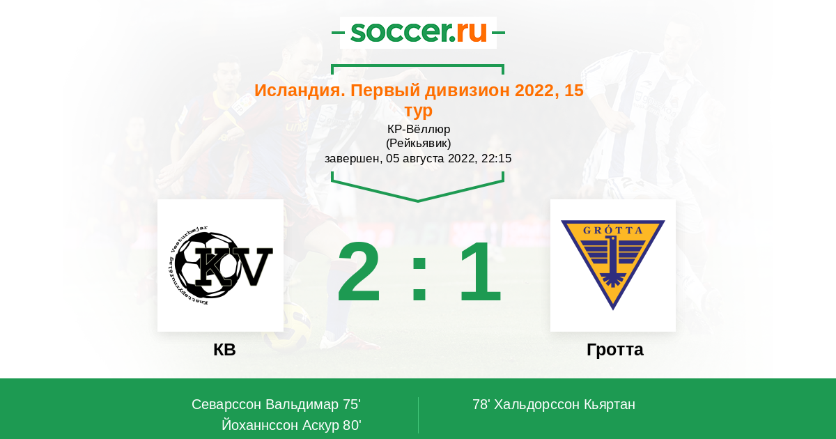 Исландия. 2-й дивизион 16.07.2012 КВ Логотип футбольный клуб КВ (Рейкьявик) 2:1 Логотип футбольный клуб Гротта (Сельтьяднарнес) Гротта