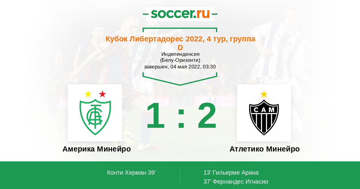 Кубок Либертадорес 14.04.2022 Атлетико Минейро Логотип футбольный клуб Атлетико Минейро (Белу-Оризонти) 1:1 Логотип футбольный клуб Америка Минейро (Белу-Оризонти) Америка Минейро