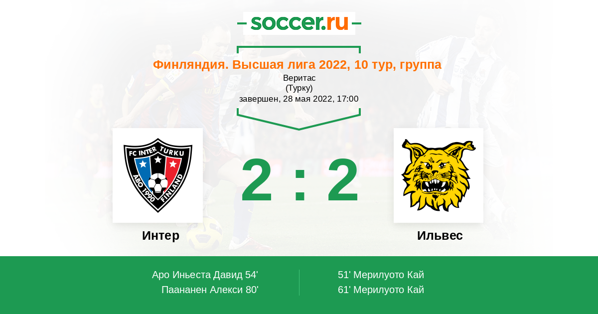 Финляндия. Высшая лига 22.05.2024 Ильвес Логотип футбольный клуб Ильвес (Тампере) 3:0 Логотип футбольный клуб Интер (Турку) Интер