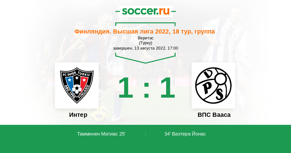 Финляндия. Высшая лига 25.06.2012 Интер Логотип футбольный клуб Интер (Турку) 1:1 Логотип футбольный клуб ВПС Вааса ВПС Вааса