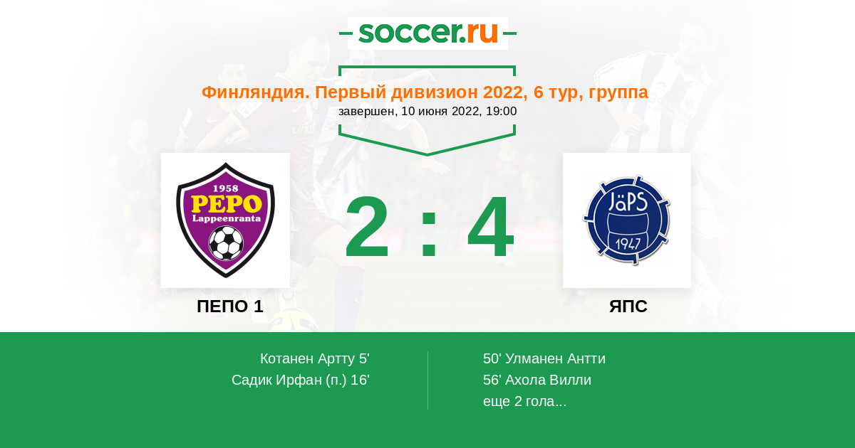 Финляндия. Какконен. Группа A 09.06.2018 ПЕПО 1 Логотип футбольный клуб ПЕПО 1 (Лаппеэнранта) 2:2 Логотип футбольный клуб ЯПС (Ярвенпяя) ЯПС