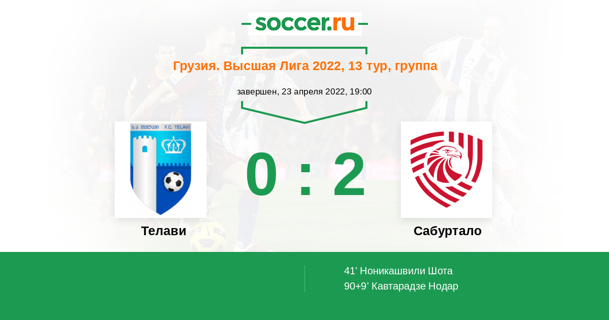 Грузия. Высшая лига 16.09.2021 Сабуртало Логотип футбольный клуб Сабуртало (Тбилиси) 2:1 Логотип футбольный клуб Телави Телави