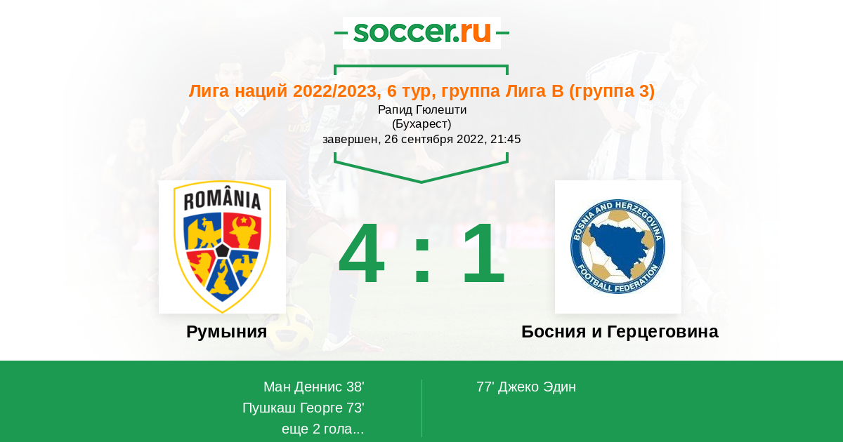 Сборная Боснии и Герцеговины поставленную задачу занять первое место в группе Лиги Наций выполнила досрочно, теперь можно расслабиться и милостливо уступить на выезде аутсайдеру сборной Румынии. Румыны еще могут спастись от вылета.