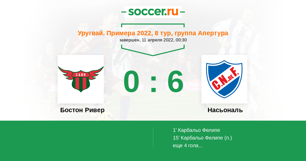 Уругвай. Примера A 15.04.2018 Насьональ Логотип футбольный клуб Насьональ (Монтевидео) 1:0 Логотип футбольный клуб Бостон Ривер (Монтевидео) Бостон Ривер