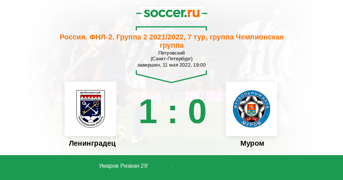 Россия. Вторая лига. Группа 2 18.05.2021 Муром Логотип футбольный клуб Муром 0:1 Логотип футбольный клуб Ленинградец (Ленинградская обл.) Ленинградец