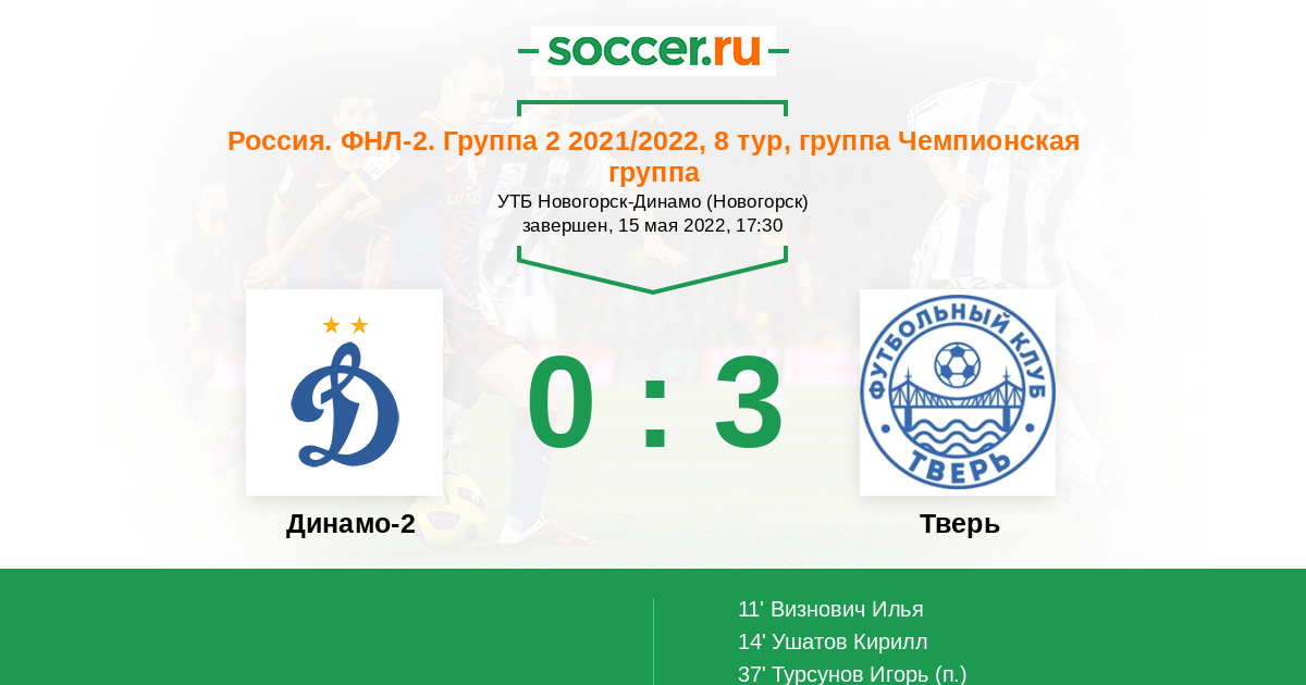 Россия. Вторая лига. Группа 2 30.07.2022 Динамо-2 Логотип футбольный клуб Динамо-2 (Москва) 2:0 Логотип футбольный клуб Тверь Тверь