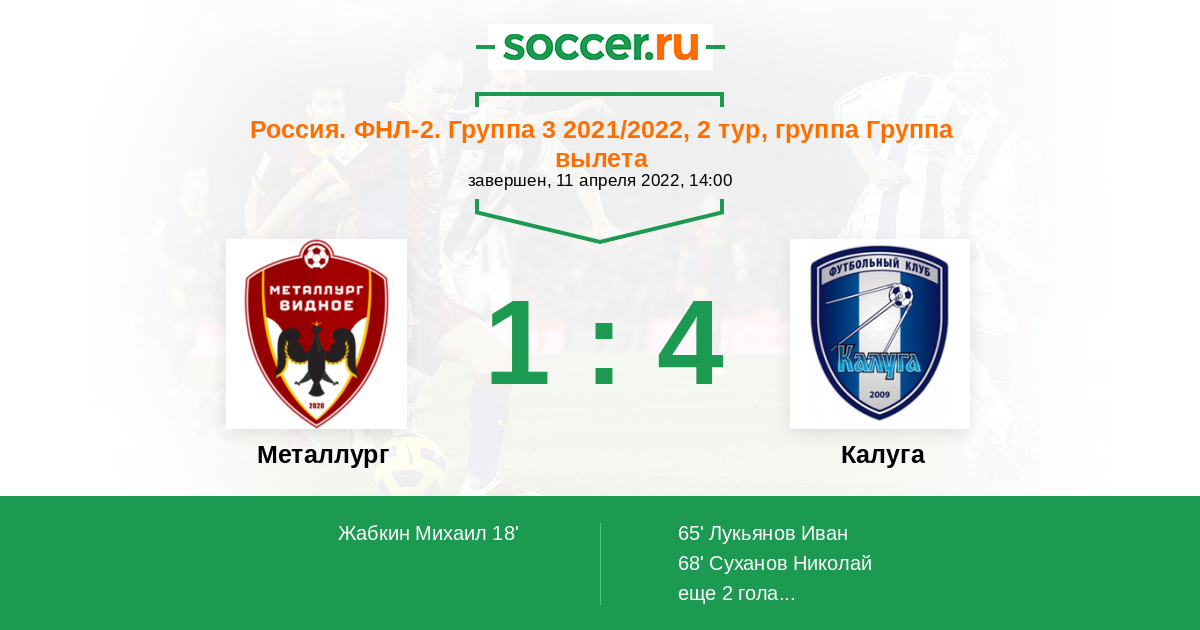 Россия. Вторая лига. Группа 3 11.04.2022 Металлург Логотип футбольный клуб Металлург (Видное) 1:4 Логотип футбольный клуб Калуга Калуга
