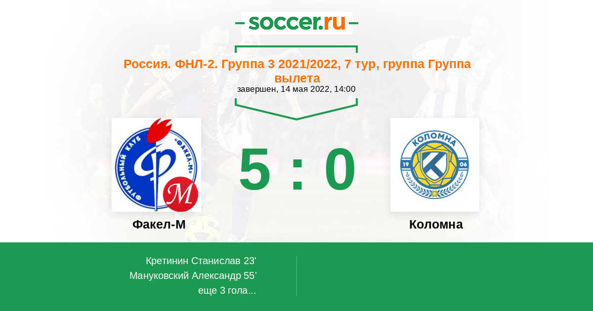 Россия. Вторая лига. Группа 3 14.05.2022 Факел-М Логотип футбольный клуб Факел-М (Воронеж) 5:0 Логотип футбольный клуб Коломна Коломна