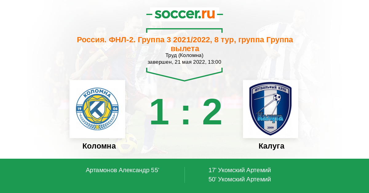 Россия. Вторая лига. Группа 3 16.04.2022 Калуга Логотип футбольный клуб Калуга 5:0 Логотип футбольный клуб Коломна Коломна