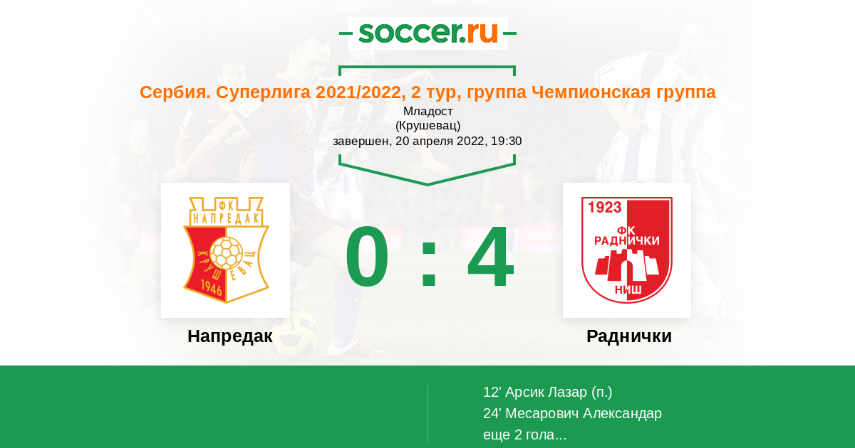 Сербия. Суперлига 24.07.2021 Раднички Логотип футбольный клуб Раднички (Ниш) 4:2 Логотип футбольный клуб Напредак (Крушевац) Напредак