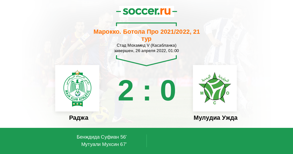Марокко. Ботола Про 20.05.2021 Мулудиа Ужда Логотип футбольный клуб Мулудиа Ужда 0:2 Логотип футбольный клуб Раджа (Касабланка) Раджа