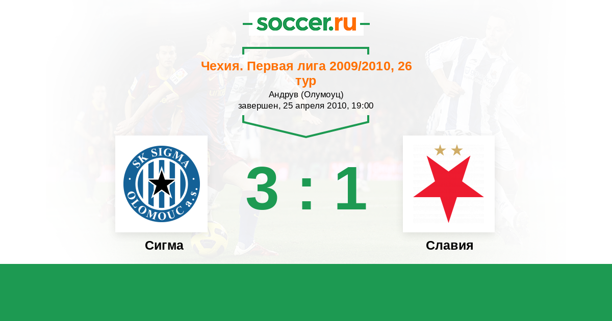 Чехия. Первая Лига 26.10.2009 Славия Логотип футбольный клуб Славия (Прага) 1:2 Логотип футбольный клуб Сигма (Оломоуц) Сигма