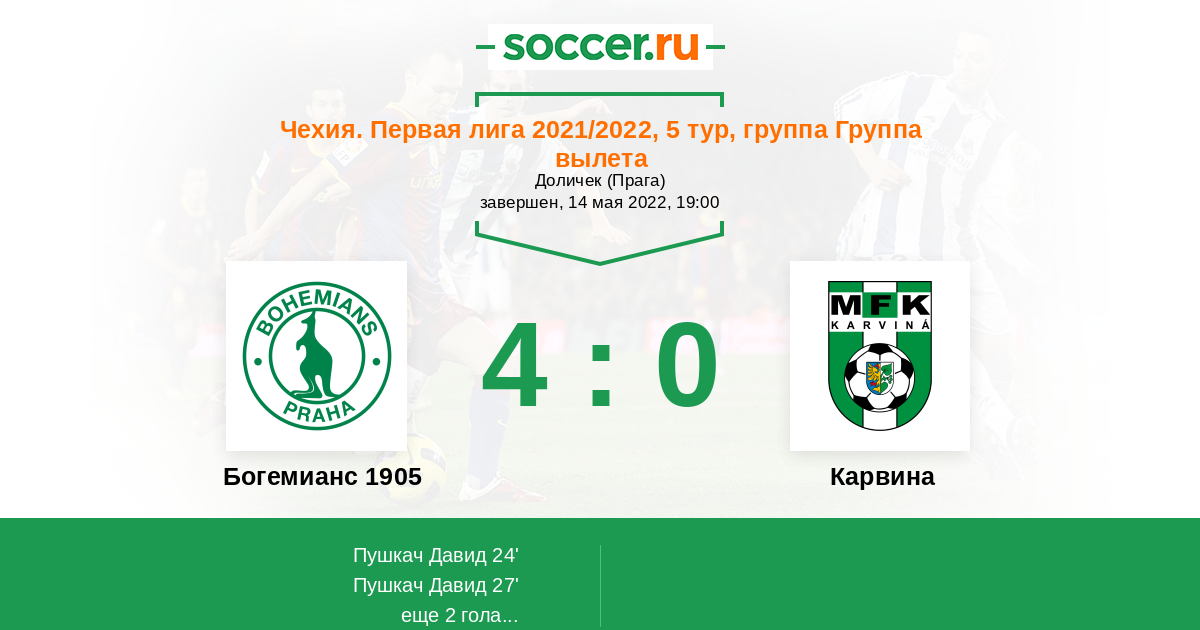Чехия. Первая Лига 20.05.2017 Богемианс 1905 Логотип футбольный клуб Богемианс 1905 (Прага) 2:0 Логотип футбольный клуб Карвина Карвина
