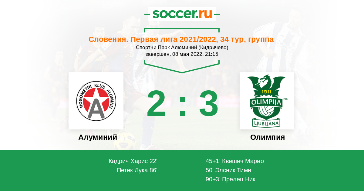 Словения. Первая Лига 02.05.2021 Олимпия Логотип футбольный клуб Олимпия (Любляна) 2:2 Логотип футбольный клуб Алуминий (Кидричево) Алуминий