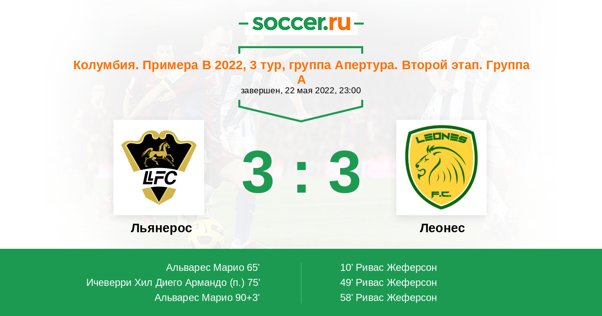 Колумбия. Примера B 04.06.2013 Леонес Логотип футбольный клуб Леонес (Итагуи) 3:2 Логотип футбольный клуб Льянерос (Вильявисенсио) Льянерос