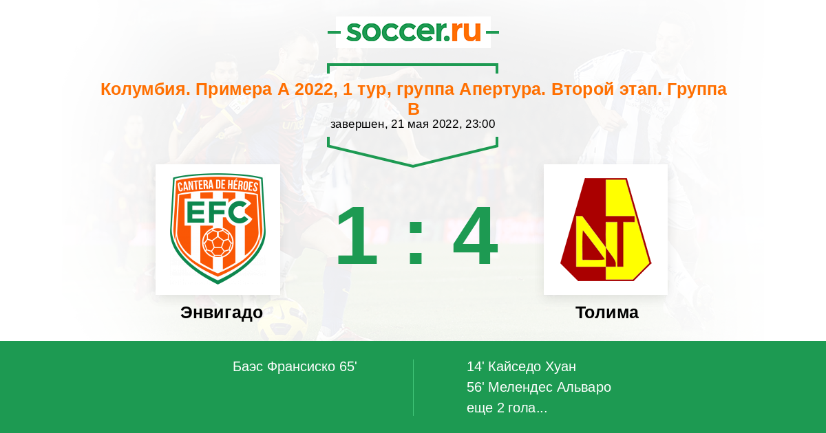 Колумбия. Примера А 15.05.2022 Толима Логотип футбольный клуб Толима (Ибаге) 1:1 Логотип футбольный клуб Энвигадо Энвигадо