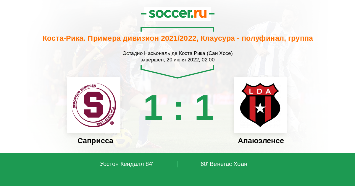 Коста-Рика. Примера дивизион 28.04.2022 Саприсса Логотип футбольный клуб Саприсса (Сан Хосе) 2:0 Логотип футбольный клуб Алаюэленсе (Алаюэла) Алаюэленсе
