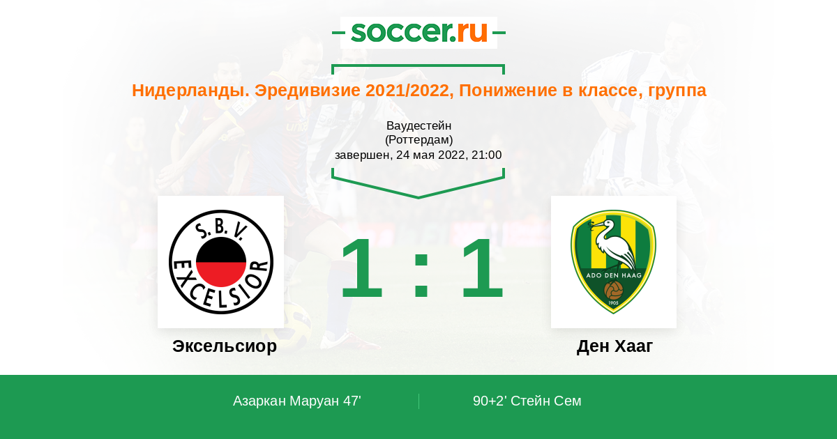 Нидерланды. Первый дивизион 25.01.2022 Эксельсиор Логотип футбольный клуб Эксельсиор (Роттердам) 2:3 Логотип футбольный клуб Ден Хааг (Гаага) Ден Хааг