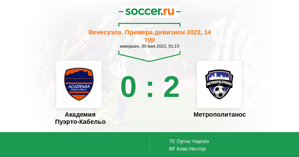Венесуэла. Примера дивизион 20.06.2022 Метрополитанос Логотип футбольный клуб Метрополитанос (Лос-Текес) 0:2 Логотип футбольный клуб Пуэрто-Кабельо Пуэрто-Кабельо