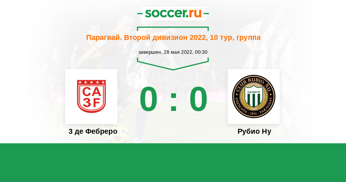 Парагвай. Второй дивизион 17.06.2019 3 де Фебреро Логотип футбольный клуб 3 де Фебреро (Сьюдад-дель-Эсте) 1:2 Логотип футбольный клуб Рубио Ну (Асунсьон) Рубио Ну