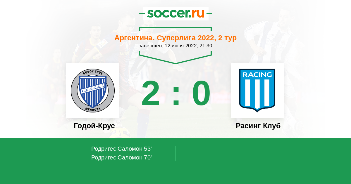 Аргентина. Суперлига 11.12.2021 Расинг Клуб Логотип футбольный клуб Расинг Клуб (Авельянеда) 2:1 Логотип футбольный клуб Годой-Крус Годой-Крус