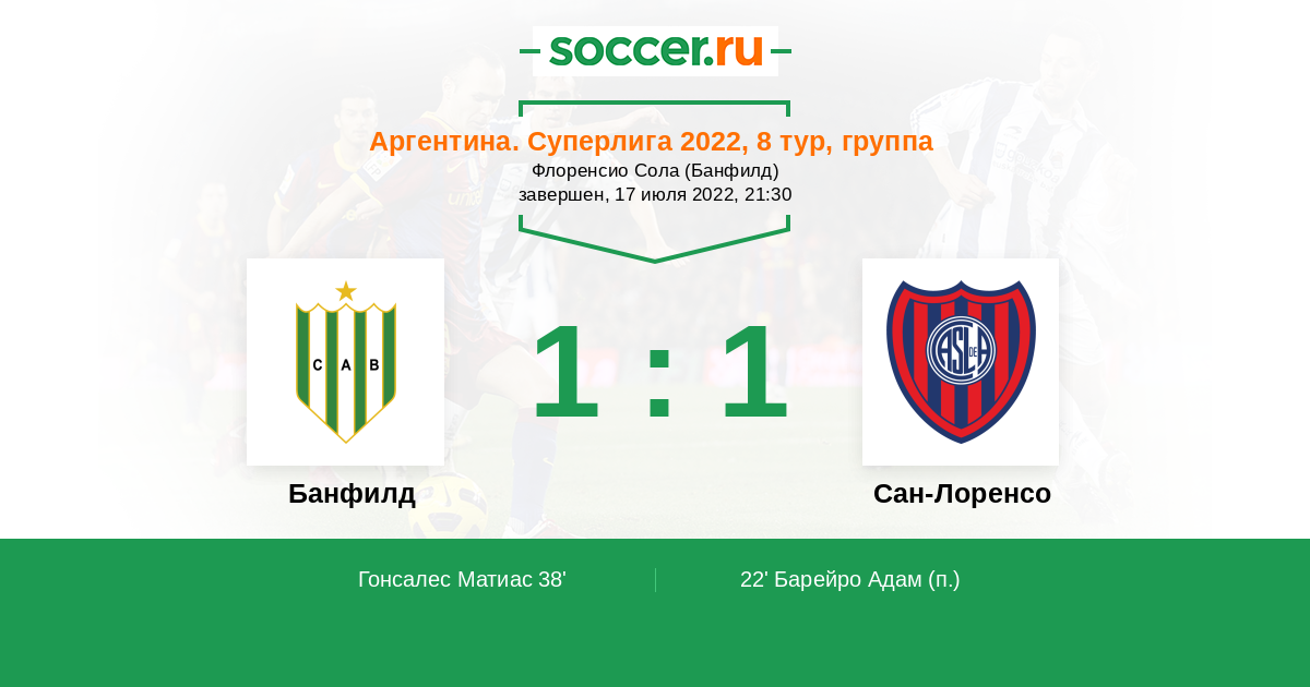 Аргентина. Суперлига 02.08.2021 Сан-Лоренсо Логотип футбольный клуб Сан-Лоренсо (Буэнос-Айрес) 1:1 Логотип футбольный клуб Банфилд Банфилд