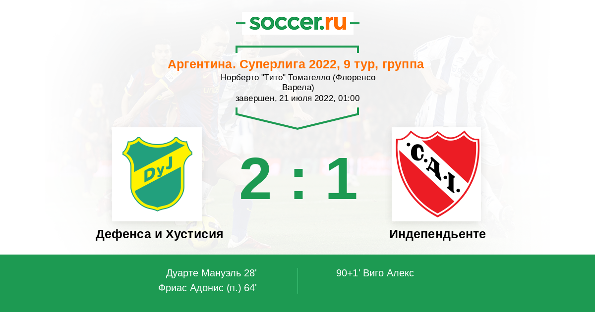 Аргентина. Суперлига 19.04.2021 Индепендьенте Логотип футбольный клуб Индепендьенте (Авельянеда) 1:0 Логотип футбольный клуб Дефенса и Хустисия (Флоренсио-Варела) Дефенса и Хустисия